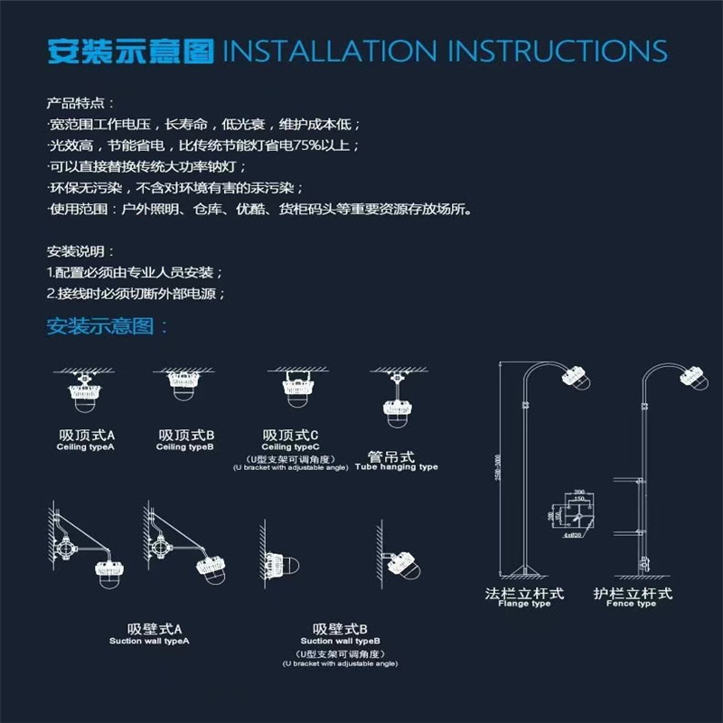 本產(chǎn)品有長短兩款,短款做到功率50W內(nèi),可以吸頂式,護欄式,吊桿式,等各種安裝方式